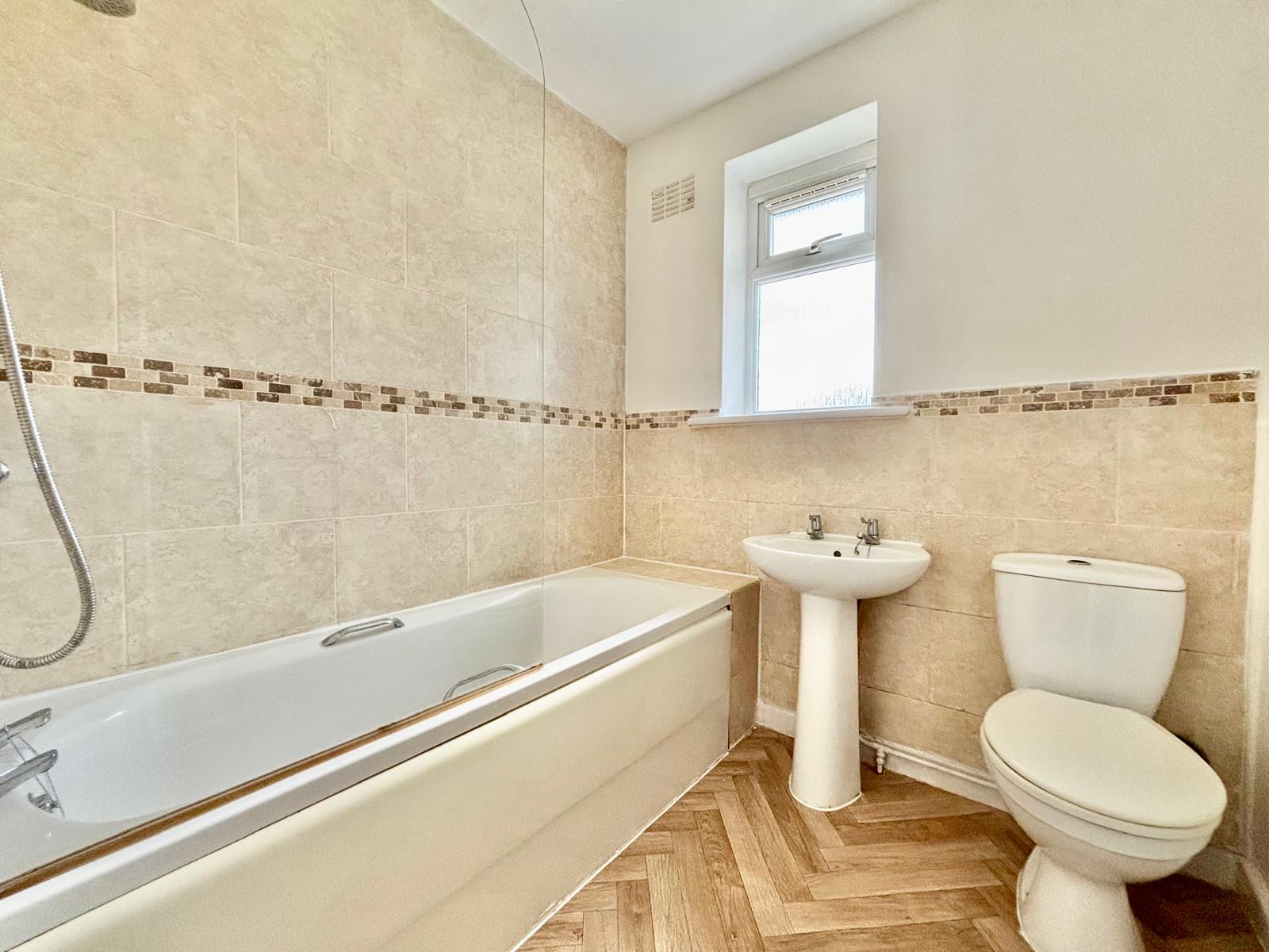 BATHROOMWhite suite of panelled bath in a fully tiled surround with a mains-fed shower and glazed shower screen. Low level WC and pedestal wash hand basin. Electric ladder style radiator. Part tiling of the walls. Vinyl flooring.