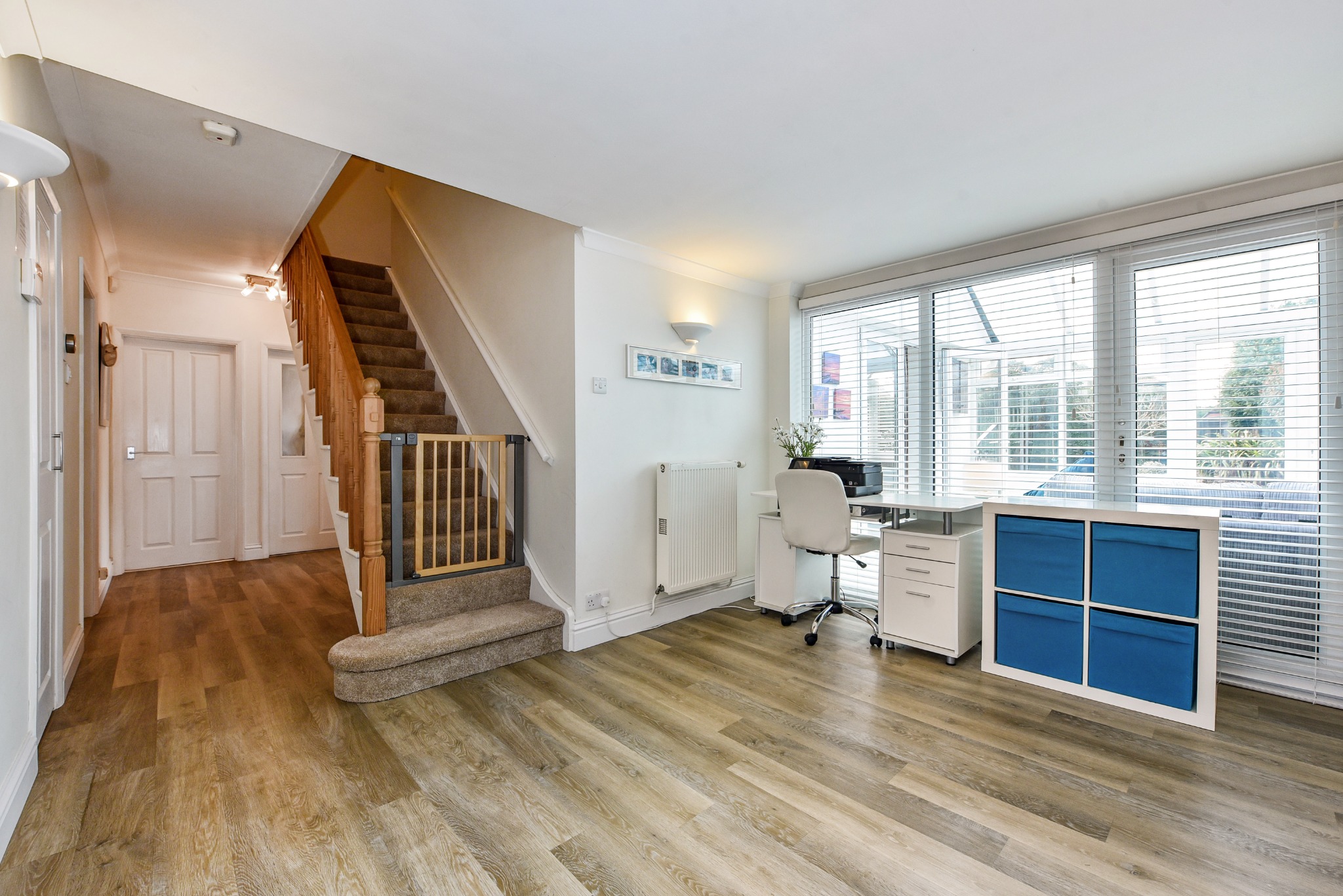 Easy rise stairs to first floor. Three wall light points. Two double radiators. Wood laminate flooring extending into:-