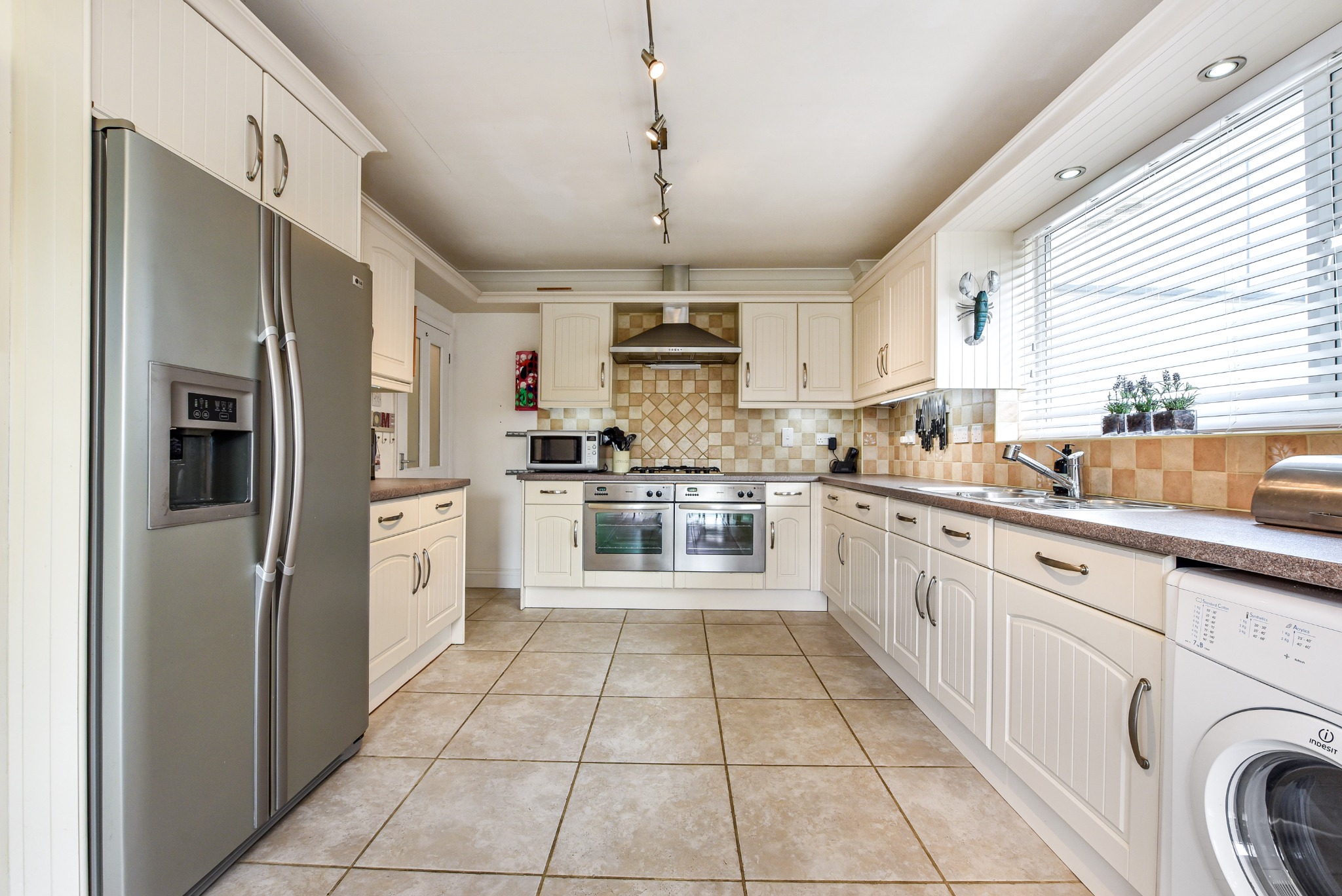 Double aspect with French doors to rear garden. Fitted in a matching range of base and wall mounted units in cream 'Shaker' style, with concealed work surface illumination over complementary work surfaces and part-tiling to walls. Inset one-and-a-half bowl single-drainer stainless steel sink unit with integrated dishwasher to side plus space and plumbing for automatic washing machine. Twin built-in electric ovens with five-ring gas hob and extractor canopy over. Built-in LG American-style fridge/freezer with cupboard built-in above. Built-in larder-style cupboard housing a recently installed wall-mounted Alpha gas boiler supplying central heating and domestic hot water. Single radiator. Ceramic tiled floor. Wide opening to:-