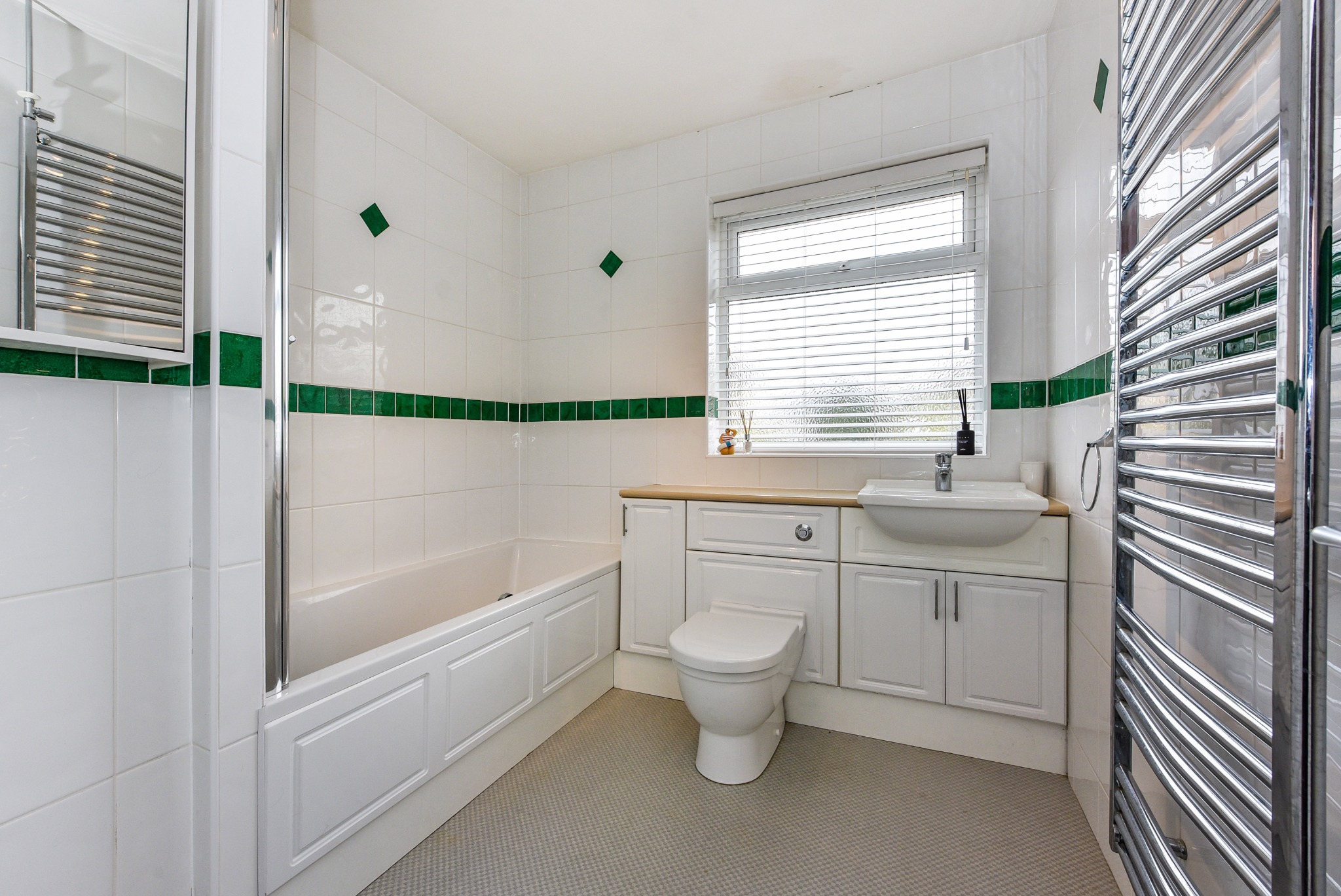 FAMILY BATHROOMFully tiled. White suite of panelled bath with mains fed shower over and glazed shower screen, wash hand basin and close-coupled WC in vanity unit with built-in cupboards. Ladder-style radiator. Vinyl flooring.