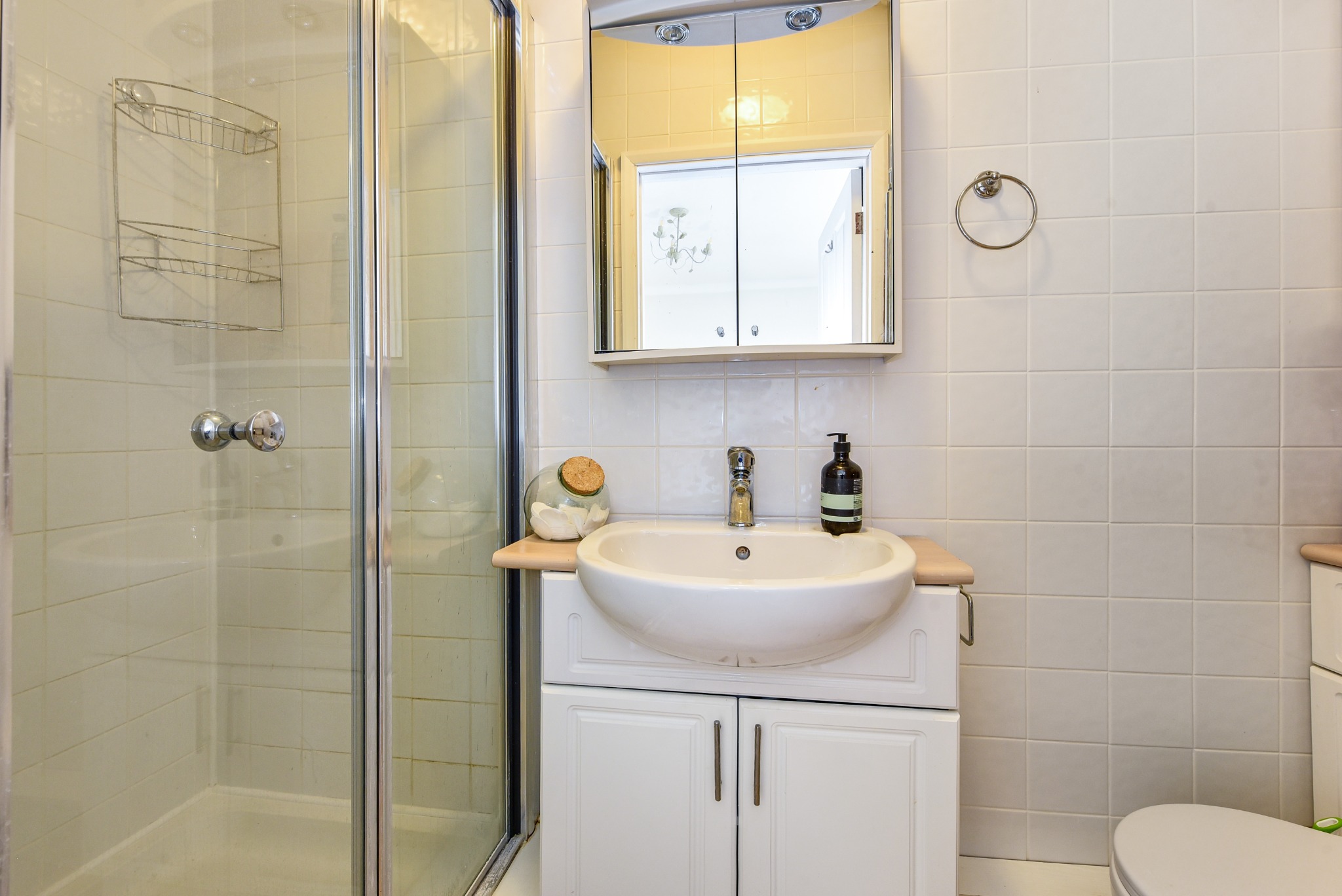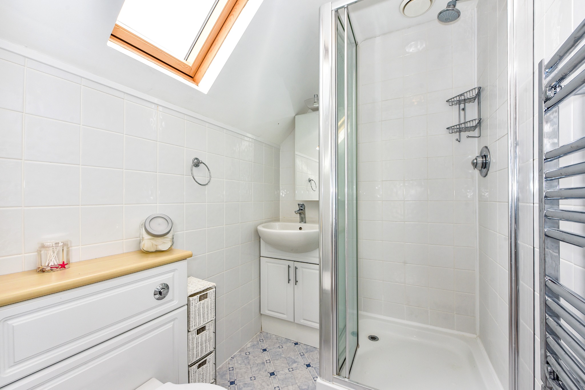EN SUITEFully tiled. White suite of enclosed shower cubicle with a mains-fed shower, close-coupled WC and wash hand basin with cupboards below. Ladder-style radiator. Vinyl flooring.