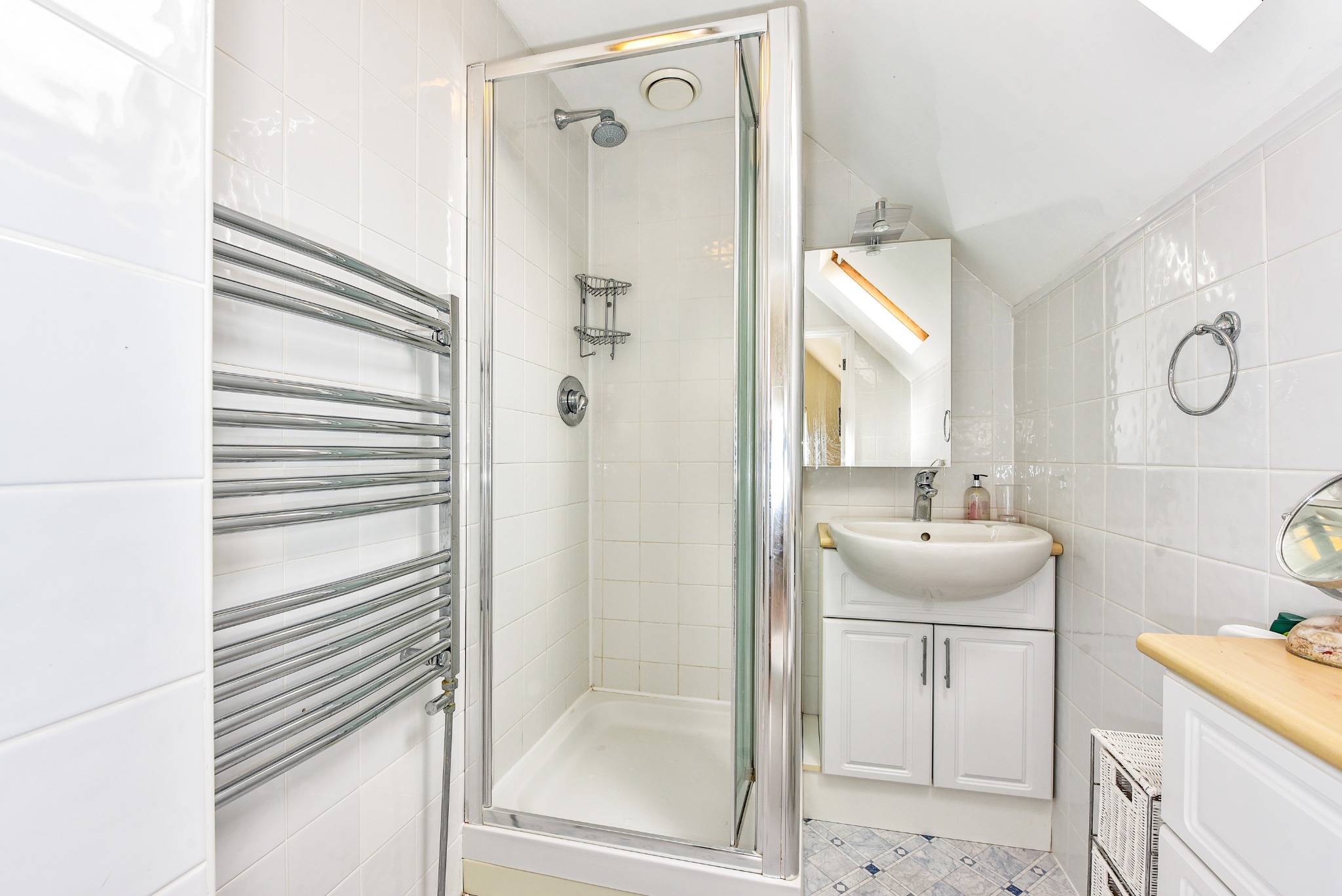 EN SUITEFully tiled. White suite of shower cubicle with mains-fed shower, close-coupled WC and wash hand basin with cupboards below. Ladder-style radiator. Vinyl flooring.